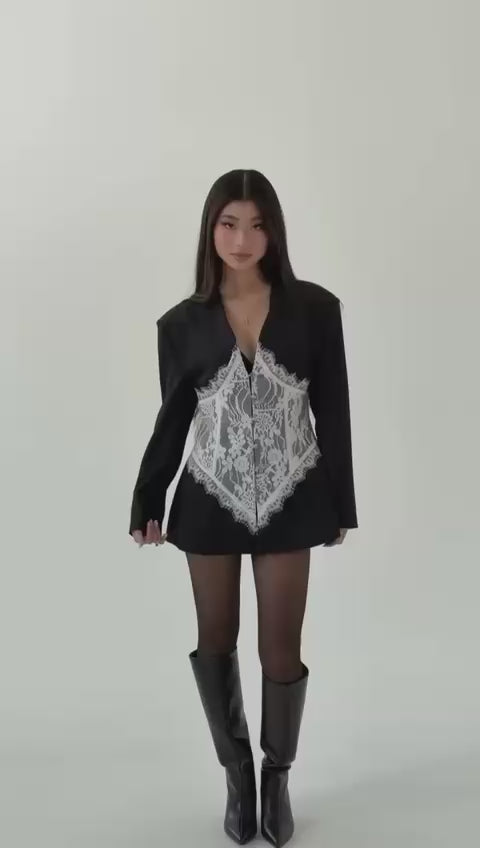 Un sacou, realizat din material premium, plăcut la atingere, cu inserții fine din dantelă ce oferă un aer sofisticat și feminin.